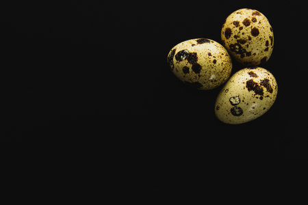 Quail eggs on a black background, close up, copy space.