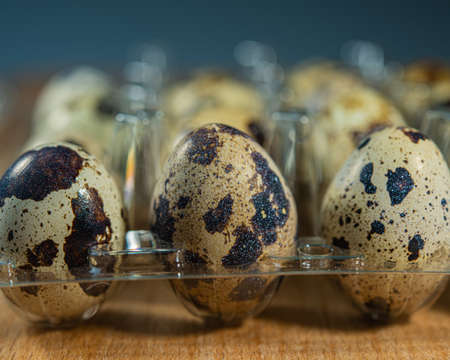 Quail eggs in a plastic container on a dark wooden background, top view, selective focus, close-up. Healthy food concept. Gourmet organic appetizer. Delicious nutritious meal. Organic delicacy in plastic socket.