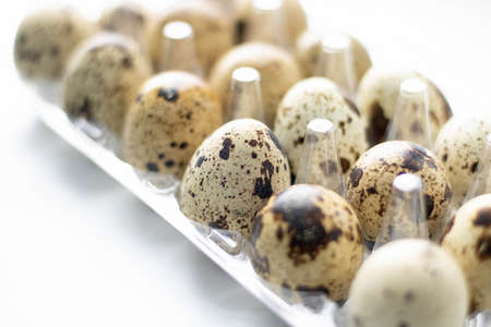 Quail eggs in plastic packaging on a white background. Selective focus.