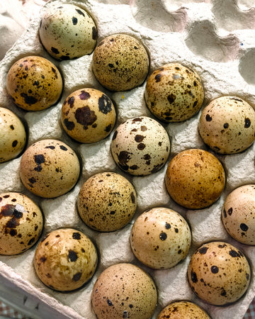 Quail eggs neatly arranged in a carton provide a striking pattern with their unique speckled shells.