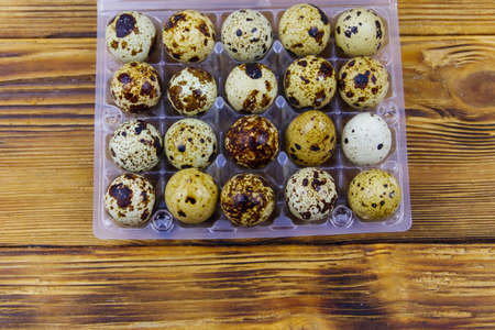 Quail eggs in a plastic box on wooden table