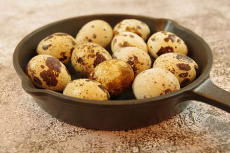 Quail eggs in a cast iron skillet on a table. Close up view