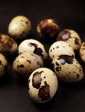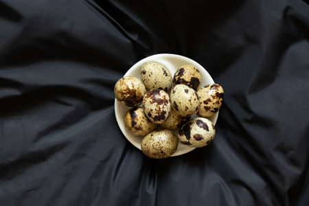 Quail eggs on a black background. Stock photo.