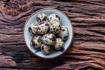 Quail eggs - Quail eggs in a ceramic bowl on old brown wooden surface background, selective focus. Top view.