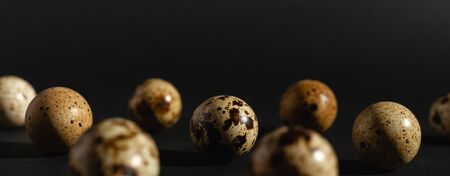 Quail eggs on black background. Healthy food concept. Selective focus