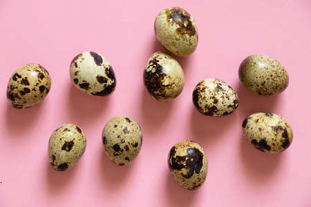 heap of quail eggs on color background. Vegetarian organic eco food.