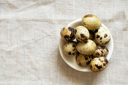 Quail eggs on a linen background. Easter concept. Toned.