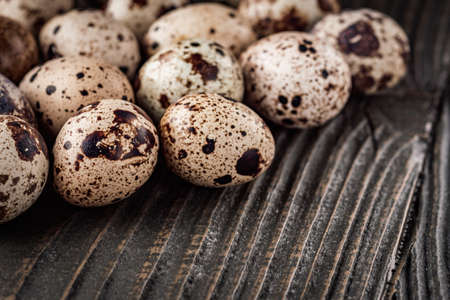 Spotted quail eggs arranged on the background of old wooden boards, with copy-space, selective focus.