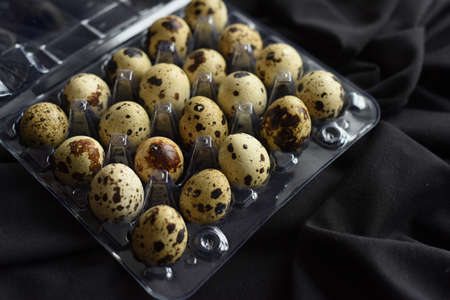 Quail eggs on a piece of black cloth. The eggs are packed in a transparent plastic container, tray. Close-up shot.