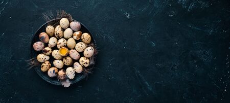Quail eggs in a black plate. On the old background. Top view. Free copy space.