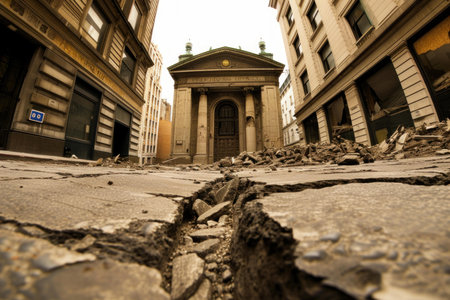 A stunning image of a cracked road surface resulting from earthquake damage, set against a backdrop of buildings and a vibrant blue sky.