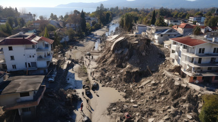 Cracked asphalt road surrounded by landslide debris, with a dramatic cloudy sky and mountains in the background, showcasing natures power