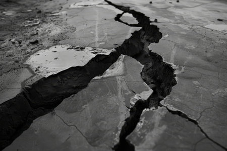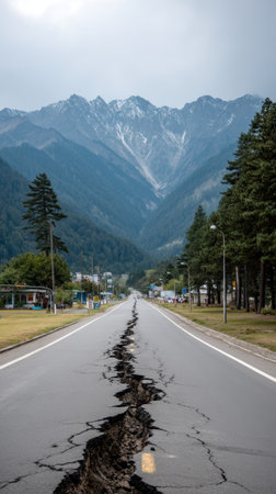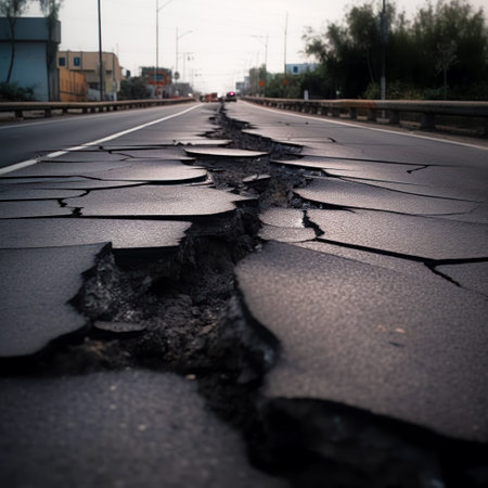 Deep cracks splitting asphalt roads after an earthquake, showcasing the immense power of seismic waves and the profound geological impact on the landscape