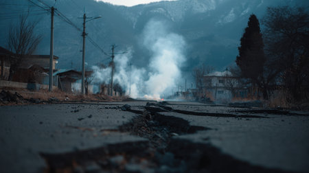 A barren road shows significant cracks and smoke rising in a somber landscape after a natural disaster. The scene illustrates urgency and despair.