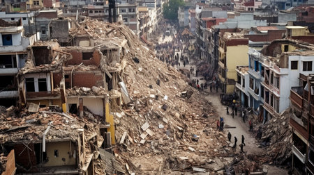 A street filled with fallen power lines, rubble, and cracked sidewalks after a massive earthquake shakes an urban area.