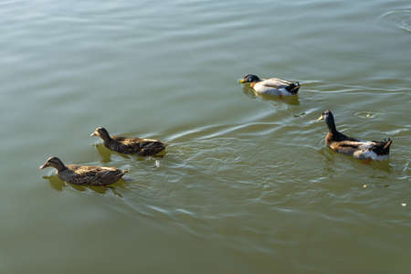 Few small brown, black, white, and yellow wild male female mallard ducks swimming floating in lake or river on the background of the water surface