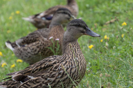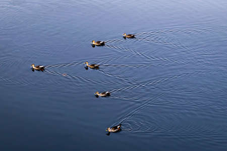 Bunch of adorable ducks flowing on water, swimming in clean lake on warm summer day. Wild birds with brown, black and white feathers enjoying waves, decorating nature with wonderful vitality.