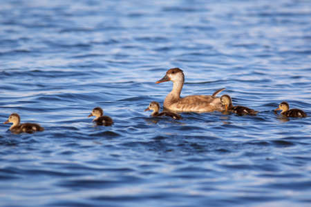 Mother duck swimming with newly hatched baby ducks. Duck on the water. Splendid closeup natural scene on the lake.