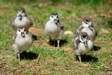 Egyptian goose goslings (Alopochen aegyptiaca) running across the grass
