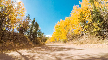 Driving on small mountain dirt roads from Colorado Springs to Cripple Creek in Autumn.