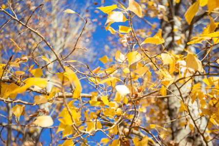 Fall nature landscape. Closeup of yellow leaves over defocused blue sky background.