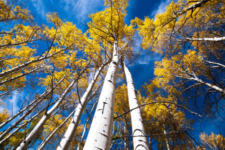 In the san juan range of the Colorado Rocky Mountains, autumn turns aspen trees a golden yellow that contrasts their white trunks.