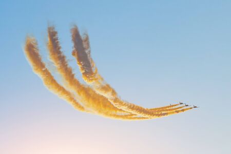 Aerobatic team group of fighters jet flies in the sky with brightly colored smoke under the setting sun in the evening sky.