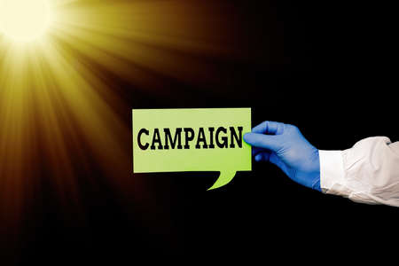 Word writing text Campaign. Business photo showcasing connected operations designed to bring about a particular result Displaying Empty Sticker Paper Accessories Smartphone With Medical Gloves On