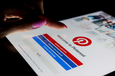 Sankt-Petersburg, Russia, December 21, 2017: A woman's hand is touching Apple iPad Pro at night with Internet service Pinterest on the screen. Pinterest application on tablet computer screen.