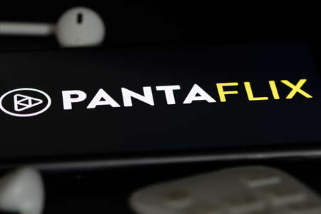Rheinbach, Germany 5 June 2021, The logo of the streaming service Pantaflix on the screen of a smartphone with white headphones and a remote control