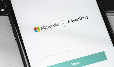 Microsoft Ads (Advertising) app on the screen smartphone closeup. Microsoft Advertising is a service that provides pay-per-click advertising like Bing. Moscow, Russia - August 15, 2020