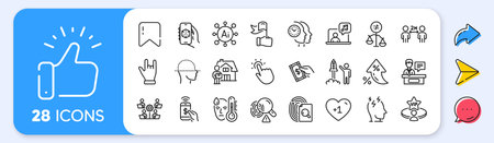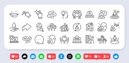Uv protection, Fraud and Human rating line icons pack. Social media: share, comment, like icons. Love couple, Inspect, Leadership web icon. Digestion, Bid offer, Salary pictogram. Vector