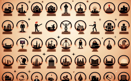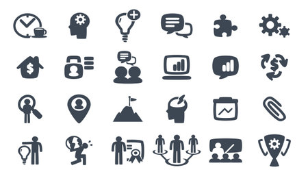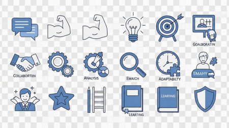 This image features a collection of icons representing different business and personal development concepts, including collaboration, analysis, learning, and goal setting.