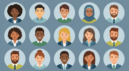 Diverse global team members group in circles. Multicultural business people avatars set for international collaboration.