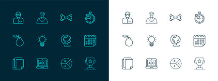 Set line Stopwatch Laptop Earth globe Pie chart infographic Creative lamp light idea Molecule Teacher and Graduate and graduation cap icon. Vector.