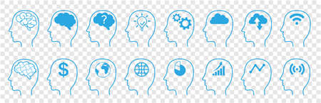 A collection of blue heads with various icons and words. The heads are arranged in a row and the icons and words are scattered across the heads