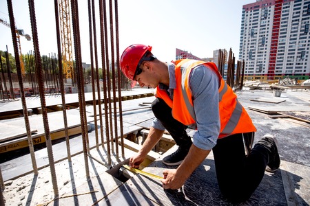 Civil engineer dressed in shirt, orange work vest and helmet measures the hole with a tape measure on the building site
