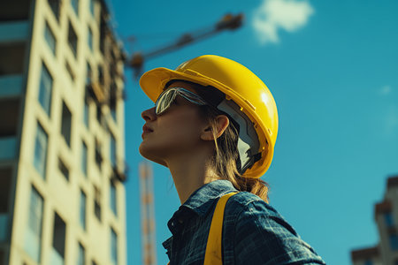 Construction worker in yellow hard hat on site with building under sunny blue sky