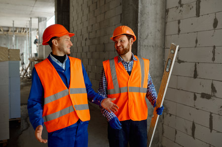 Two builders in uniform walking and talking about construction