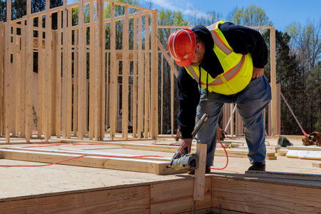 Contractor worker is hammering nail in process of framing new wooden house.