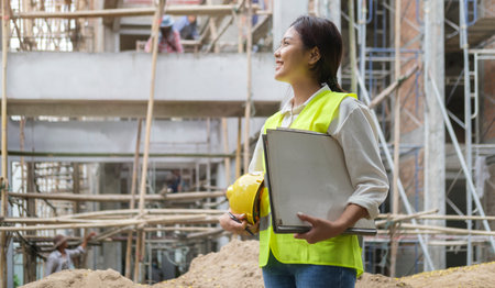 Young female civil engineer with protective helmets and vest standing in construction site. Engineering and architecture concept.