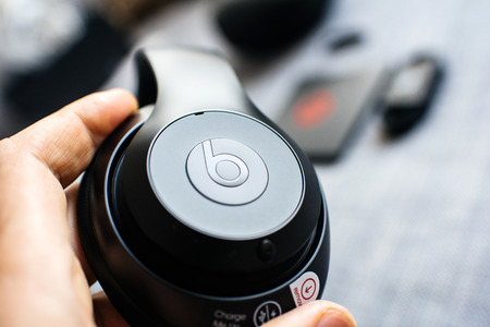 PARIS, FRANCE - MAR 31, 2018: Man unboxing new Apple Beats By Dr Dre Beats Studio 3 Wireless headphones with Pure Adaptive Noise Canceling (Pure ANC) - Beats logotype