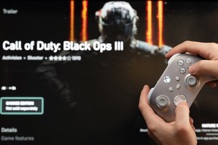New york, USA - February 20, 2023: Gamer start new Call of Duty Game on xbox console with joystick in hand