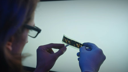 Examination of Filmstrip on Lightbox with Careful Hand