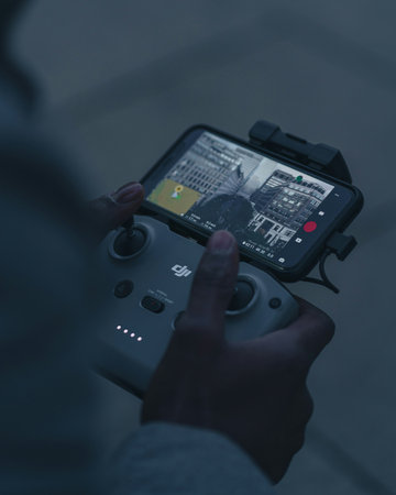 the hands of the male pilot are holding the remote control of the drone. Drone video filming.
