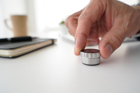 Top view of male hands using camera on black table with supplies and accessories