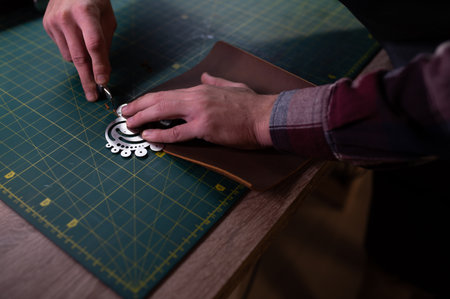 male hands of master cutting with a knife pattern from genuine leather. Hand-made leather goods manufacturing. Small business concept