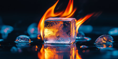 Surreal photo of a fiery ice cube, flames engulfing frozen ice, symbolizing the contrast between heat and cold in a striking visual.