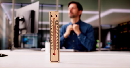 Thermometer In Front Of Businessman Working During Hot Weather In The Office