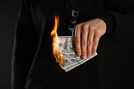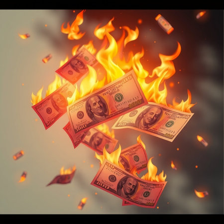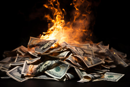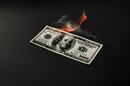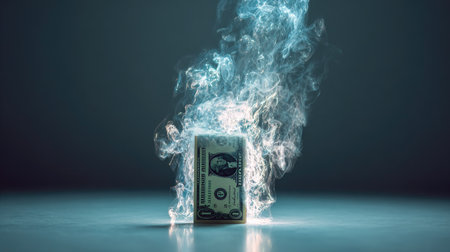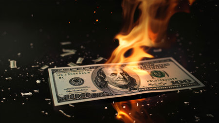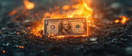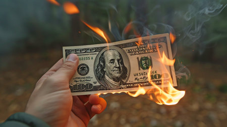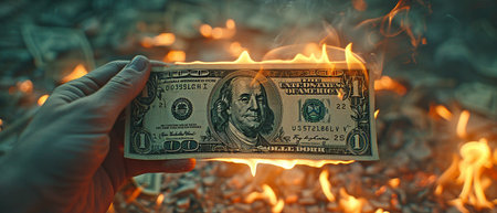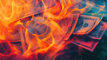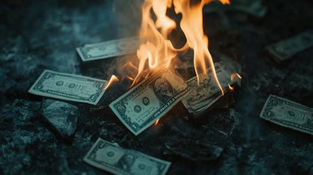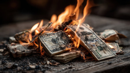 A dramatic image of a dollar bill engulfed in flames, symbolizing financial loss and waste. The visual evokes strong emotions and reflects economic struggles.
